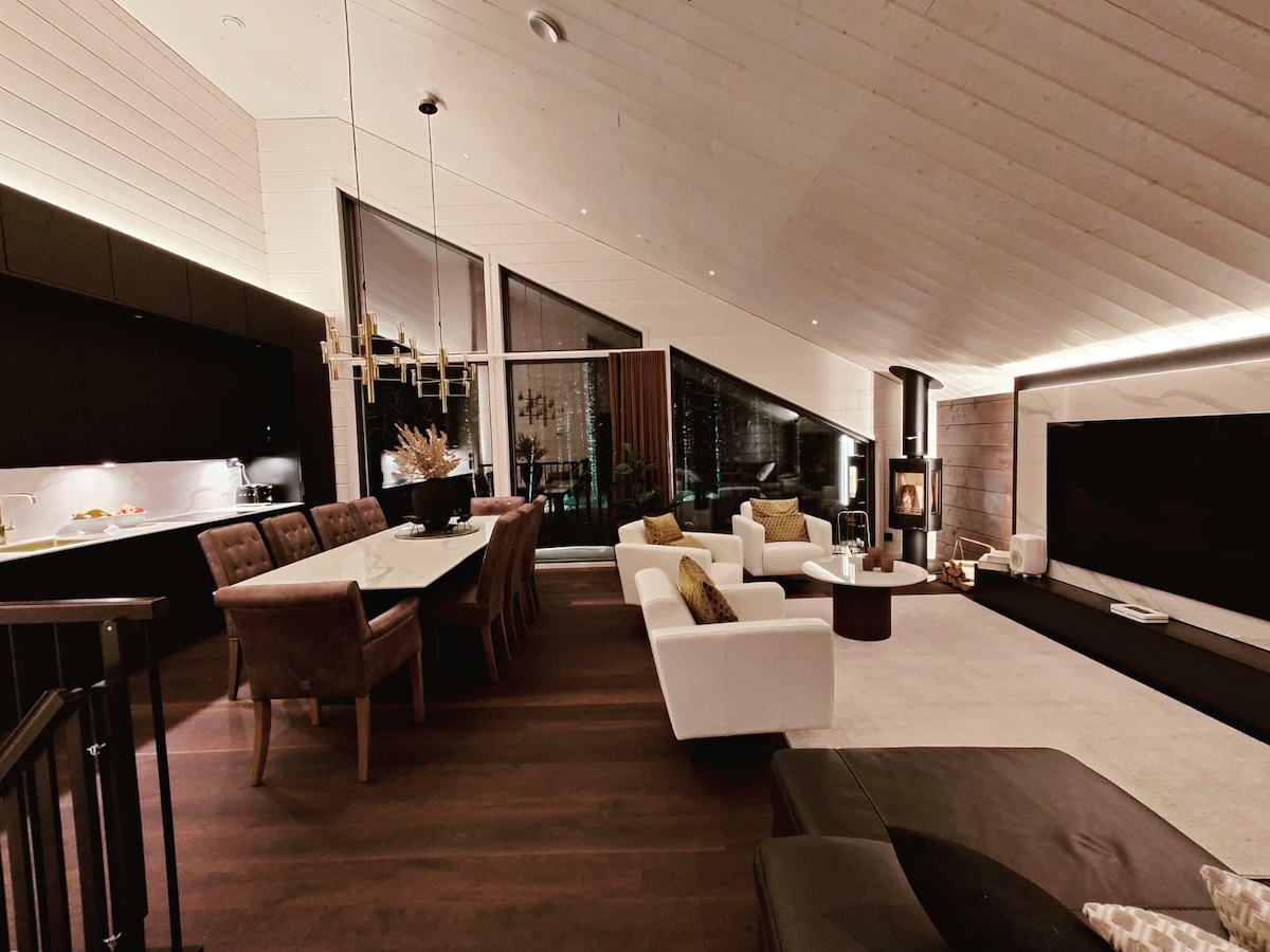 4 spacious bedrooms, a fully equipped open kitchen, housekeeping with washing machines, five bathrooms, a sauna and a large outdoor jacuzzi. It is decorated with high-quality Nordic furniture. Space on one floor of 250m2 with a terrace. It meets high international standards and that is why our popularity is growing. The ski slopes and snowmobile trails directly from the yard. Ski center is right next door. We have large activities packet with our operators. Let's make an unforgettable holiday.