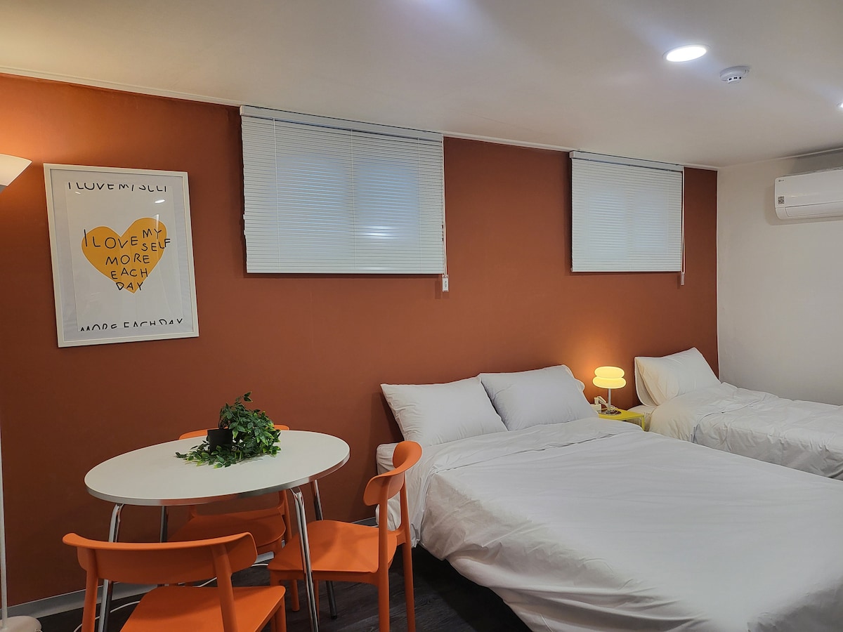 ★코레일 1호선 부천역으로부터 300m 거리로 도보로 3분내 도착이 가능한 최고의 위치를 자랑합니다. - 서울 용산역 급행열차 탑승 가능 - 서울 중심부까지 25분만에 도착 ★한국의 K-Culture를 경험하고 즐기기에 좋은 로컬 지역 - 한국에 몇개없는 대형지하상가가 부천역에 있습니다. ★숙소로부터 100m 내에 올리브영(드럭스토어), GS25/CU(편의점)가 위치해있어 외국인/내국인 관광객에게 편의성을 제공 ★본 객실은 2층에 위치하여 출입이 편리하며, 1인고객은 여유롭게 / 2인고객은 가성비 있게 숙박이 가능합니다. ※ 객실 환경 ※ -16.5 평방미터 룸 타입으로 쾌적한 개인 휴식 공간 확보 -객실내 개인화장실 보유 -넓은 현관 격실 보유 (많은 신발 보관 및 복도소음 차단) ※ 편의사항 ※ -개수대(싱크대)/정수기/전자렌지 사용 가능 -인터넷 및 케이블 TV 완비 -전 객실 도어락 설치로 보안 강화 -8채널 고화질 CCTV 설치로 공용부 24시간 보안 관리