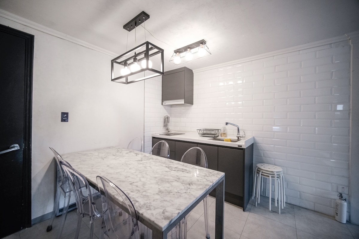 스텝 기숙사로 디자이닝된 공간입니다. - 4인까지 가능합니다 - 목동 초중심부에 위치해 있습니다 - 실사용 목적으로 리모델링했기에 공간 사용을 실용적으로 인테리어했습니다 -단열 시공되어 있습니다 - 초고속 인터넷과 콘센트도 곳곳에 준비되어 있습니다 - 400mm 폭의 2인용 바 테이블 2개와 의자 4개가 있습니다. 기본 pc(mac os)한 대와 전자렌지, 주방(싱크대, 인덕션, 후드, 냉장고), 세탁기도 설비되어 있습니다.