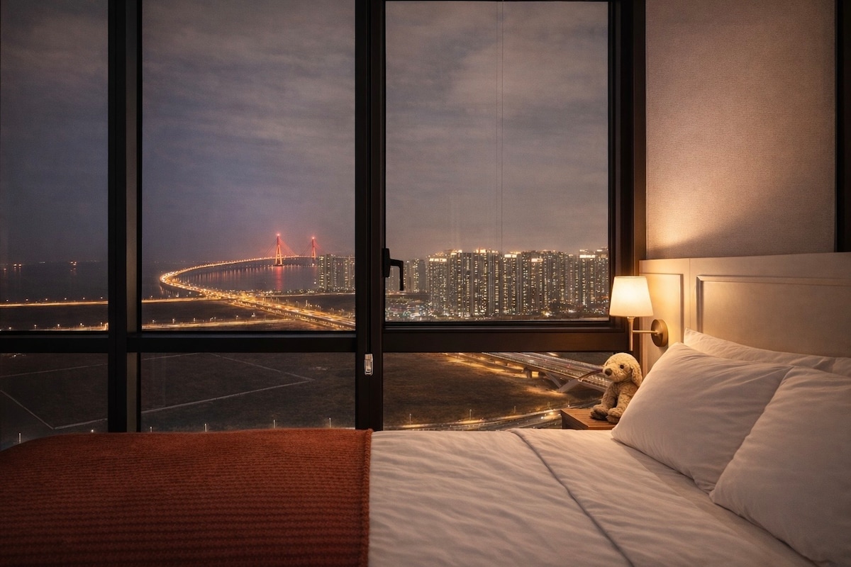 -새 매트리스로 교체하였습니다! -해당 객실에서만 볼수있는 환상적인 인천대교뷰를 보며 힐링을 해보세요. -파노라마 오션&시티뷰로 낮과 밤 모두 아름다운 풍경으로 방에만 있어도 충분히 여행하는 기분을 느낄수있어요. -많은 게스트님들이 후기로 인증해주셨어요. "사진보다 실제로 보니 훨씬 좋아요" "석양이 너무 아름다워요" "야경이 너무 예뻐요" "호텔보다도 좋아요" "시간대 상관없이 창 밖만 봐도 힐링이에요" -호텔식의 넓은 펜트하우스로 소음 걱정 없이 완전한 휴식을 할수있어요. -전문 메이드가 청소하여 청결함은 기본, 호텔 침구에서 편안한 시간을 보내보세요. -인천대교의 아름다운 뷰와 함께하는 행복한 추억을 선사하세요.