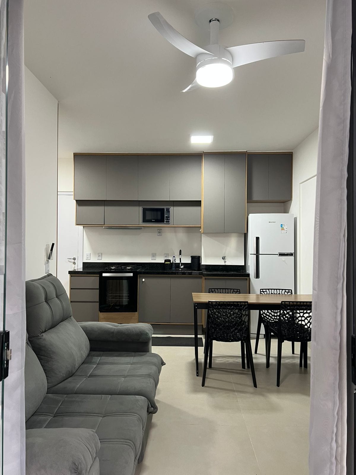 Apartamento com estrutura para seu home office! Apartamento aconchegante, moderno e com vista para o mar. Oferecemos espaço home office, com internet de alta velocidade permitindo que você possa trabalhar, e ao mesmo tempo usufruir do clima de praia. Estamos o último andar bem ventilado e iluminado. Apartamento todo equipado com infraestrutura necessária para seu bem estar "cozinha completa e 1 ambientes com ar condicionado, 2 sacadas vista mar/montanha. Nossa Voltagem de energia é 220V