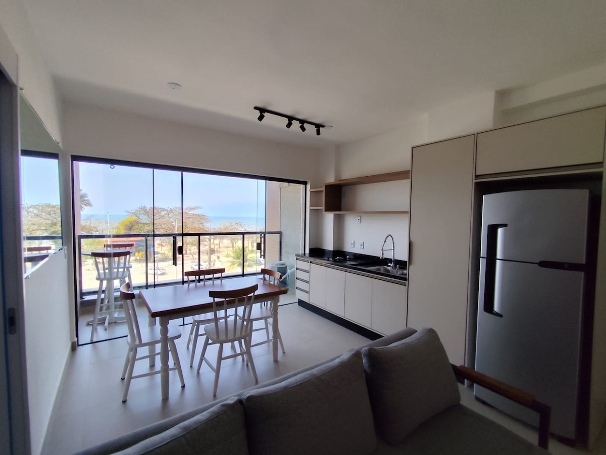 Apartamento com estrutura para seu home office! Apartamento aconchegante, moderno e com vista para o mar. Oferecemos espaço home office, com internet de alta velocidade permitindo que você possa trabalhar, e ao mesmo tempo usufruir do clima de praia. Estamos o último andar bem ventilado e iluminado. Apartamento todo equipado com infraestrutura necessária para seu bem estar "cozinha completa e 1 ambientes com ar condicionado, 2 sacadas vista mar/montanha. Nossa Voltagem de energia é 220V