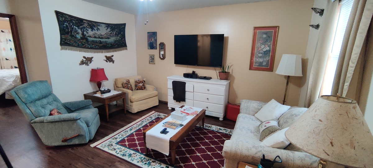 This cute vintage-styled apartment will make your visit to Batesville cozy and comfortable! This spot is centrally located in town, less than a mile from the hospital and in a peaceful, walkable neighborhood. The apartment features 2 bedrooms with one full queen bed and one full, 1 bath, cozy living room with sofa and recliners, and fully outfitted kitchen with washer and dryer.