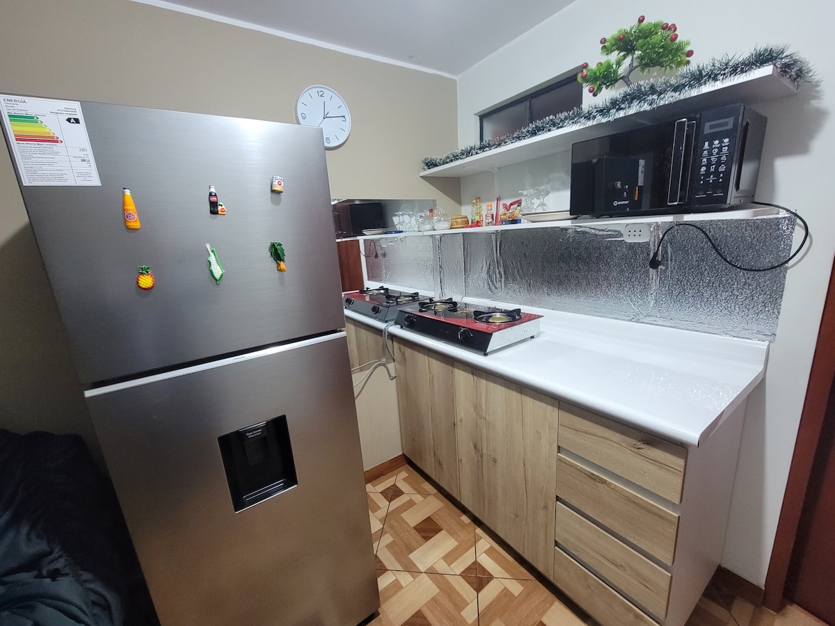 Departamento completo NO ES COMPARTIDO (totalmente independiente) tiene 2 niveles (DUPLEX 2do piso y 3ro) que lo hace diferente. En el 1er nivel está la habitación (con cama de dos plazas) y la cocina, en el 2do nivel se encuentra el baño y una habitación con cama de 1 plaza. Hay otra habitación cerrada que podría ser para huespedes adicionales también (si fuera necesario). ES TOTALMENTE INDEPENDIENTE