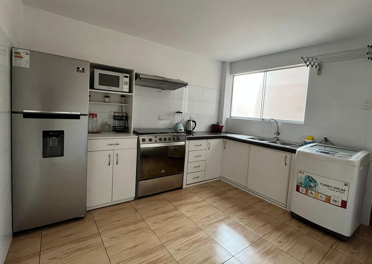 Modern and cozy apartment on the 8th floor of a building with 24/7 security, just steps away from Kennedy Park, the Miraflores Boardwalk, Larcomar, and the National Stadium. It’s close to restaurants, cafés, supermarkets, pharmacies, and banks. The building features a pool, gym, business center, kids club, BBQ area, and 24/7 security. The apartment offers high-speed Wi-Fi, a fully equipped kitchen, washing machine, and free parking — perfect for family trips, work, or relaxation.