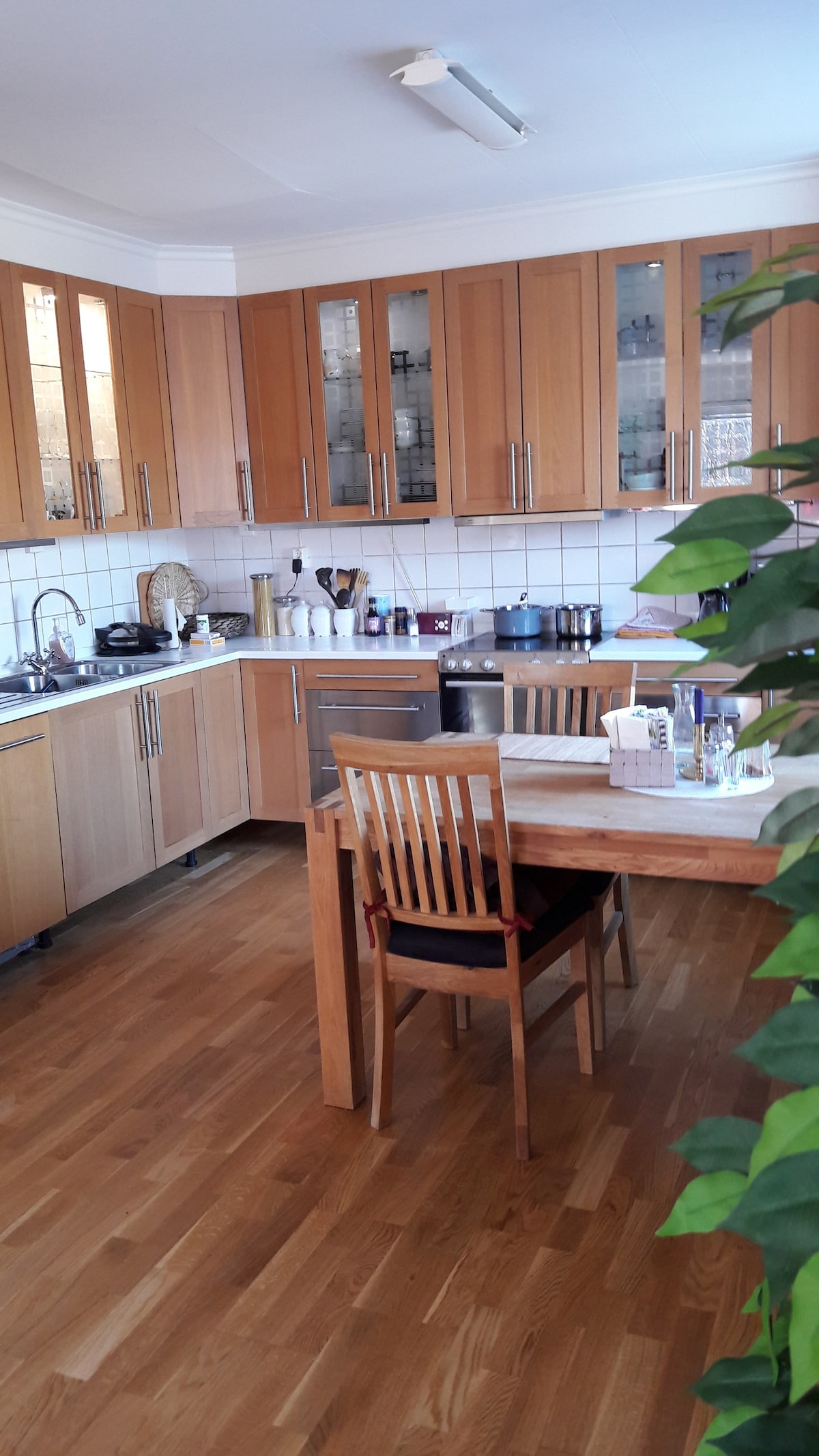 Et romslig og behagelig hus som ligger i en stor og unik hage. Huset har 3 soverom, 2 bad, vaskerom, stor stue og stort kjøkken med spisested og eget arbeidsrom. I sesong er gjester velkommen til å høste grønnsaker og frukt fra hagen. Hagen innbyr til : Morgenkaffe under et tre, meditasjon med en kornåker som bakteppe, grilling og avslapning på terrassen.