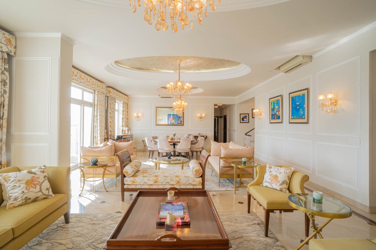 Super chic & spacious 5BHK in one of Delhi's posh neighborhoods offers a perfect blend of soothing, stylish and modern living. Spacious rooms with contemporary interiors complimenting lots of natural light&balconies make the apartment inviting for both youngsters & families. Walking distance to many cute cafes like Blue Tokai, mins away from the most popular shopping malls like Emporio, Promenade, etc. 10-15 mins drive from all the popular restaurants, hotels & markets. 15 mins from the Airport.