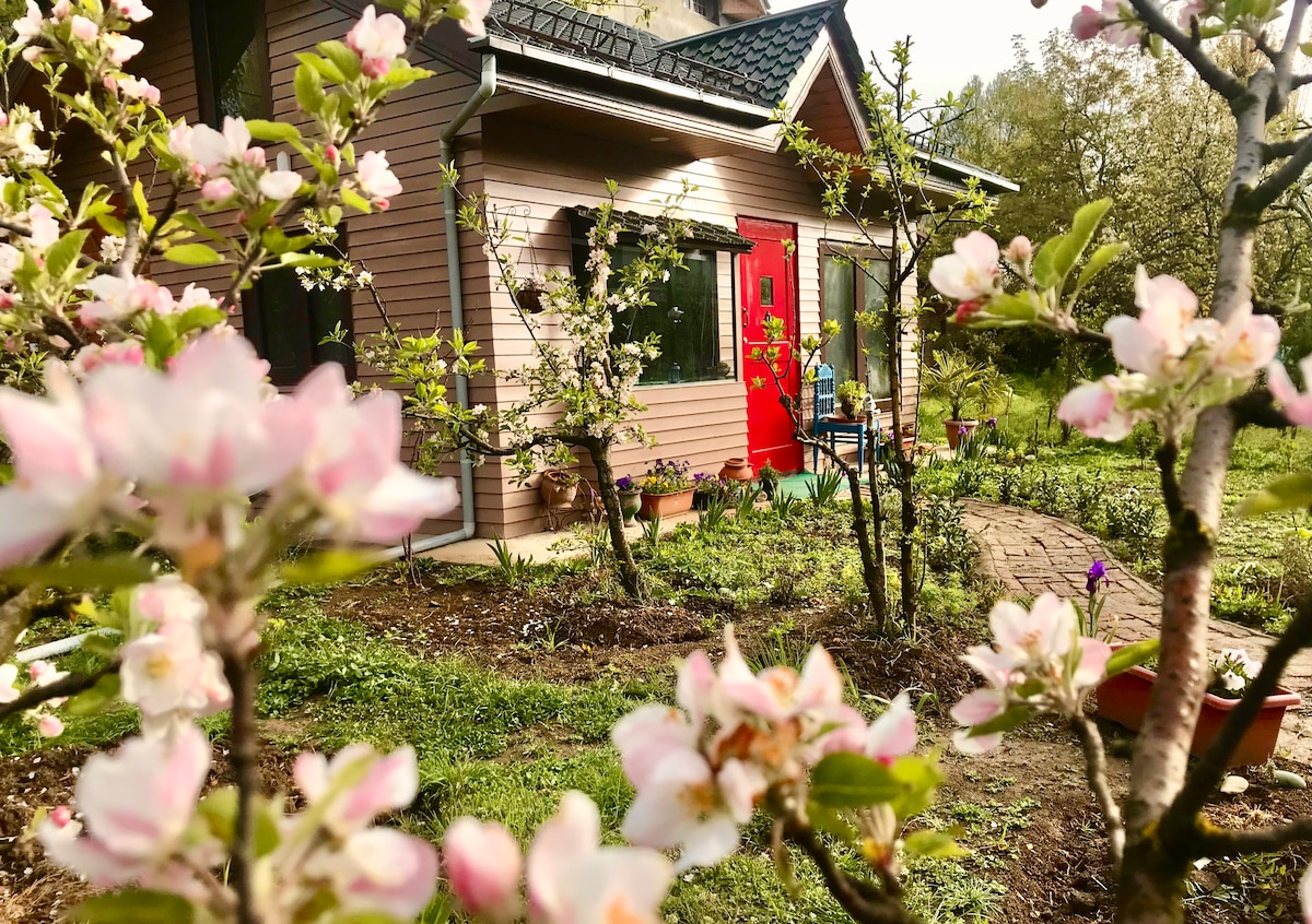 A house in the heart of the Himalayas, away from the hustle of the city. Enjoy a serene view of the valley surrounded by plum, apple, persimmon and other trees. A peaceful location which is perfect for a relaxing vacation or work-ation. Wake up to an amazing view of the mountains, enjoy a relaxing day reading a book in the balcony, or explore the many nearby sites and adventure activities; This location offers something for everyone.
