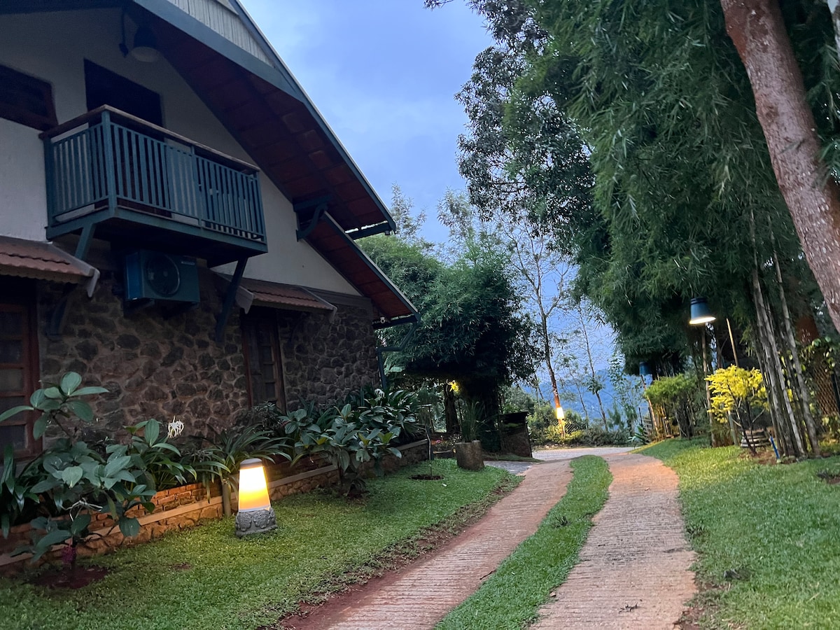 A private stone cottage for two on a forested mountaintop at 3,300 ft in Vagamon. Once part of the estate labour quarters — restored stone walls, simple interiors, a deep bathtub, and a private outdoor cabana in the trees. The quietest spot on the property. Mountain Villa is off-grid: solar powered, complimentary breakfast, no television, limited connectivity. The kind of place where the day is decided by weather and mood, not a schedule.