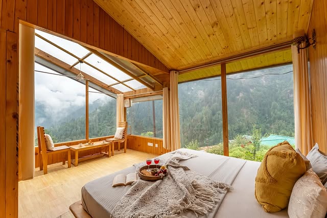 Glamoreo, just 1 hour away from Shimla. Stunning walnut wood interior, including all the furniture. Outdoor wooden bathtub, perfect for soaking in the fresh mountain air. The surrounding area is open and spacious. You can walk around, take in the scenic views, and get a feel for rural life. Everything here is organic, from food to dairy products. If you don’t feel like home-cooked meals, there are cafes and restaurants just 3–4 km away, and you can either visit them or have food delivered