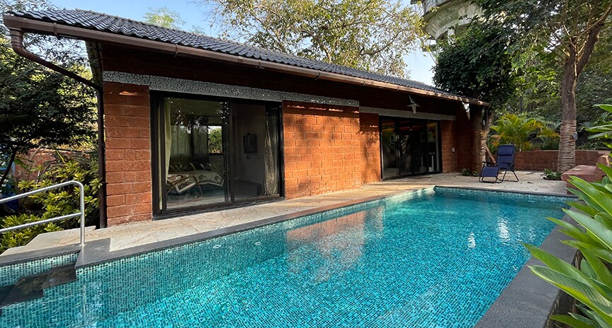 Situated in the picturesque village of Moira in North Goa this stylish, contemporary and comfortable cottage is perfect for both vacation and work. The fully equipped independent air-conditioned cottage has a spacious open plan living room with full kitchen, a bedroom with en-suite bathroom, and pool. It has its own garden, sit-out and driveway, with parking. Enjoy the peace and quiet of a Goan village while being a short drive away from all the major attractions of North Goa.
