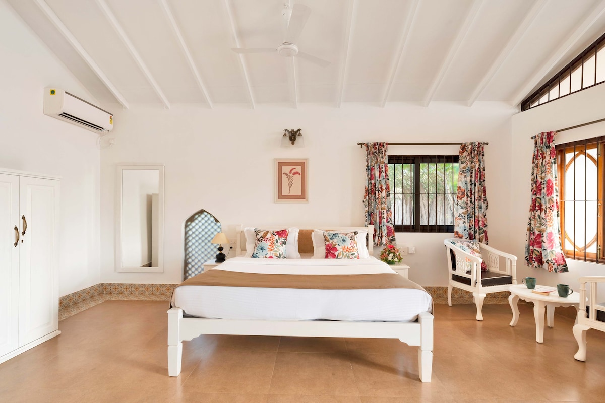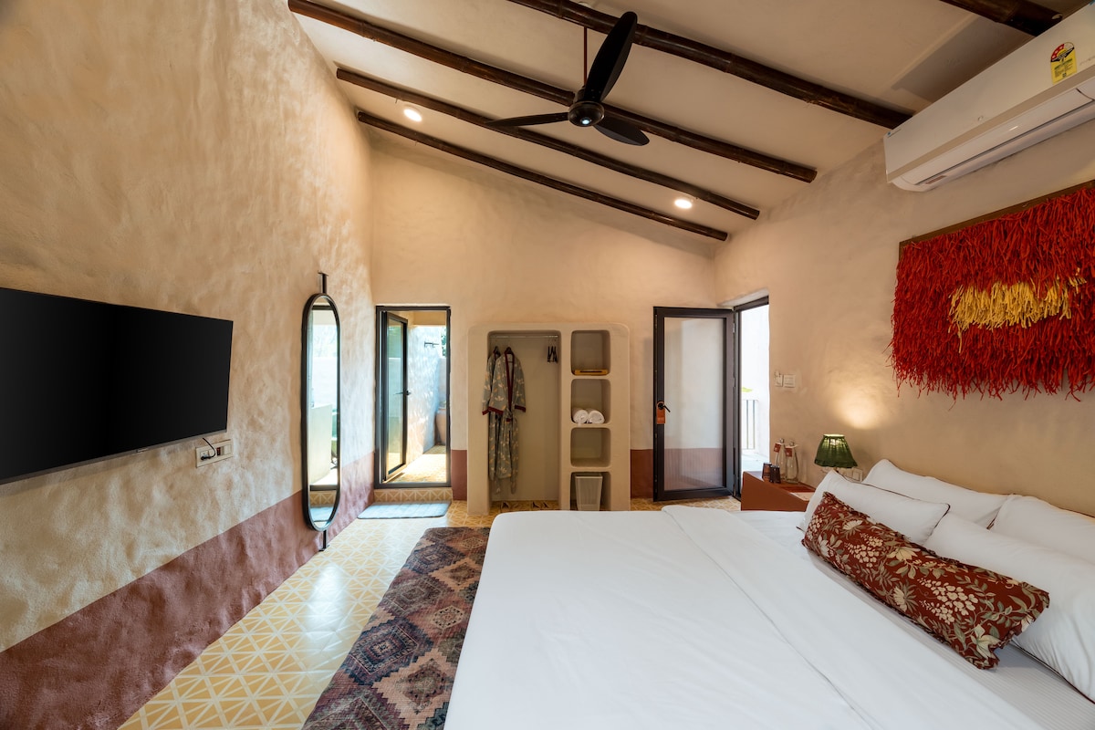 Our Signature Room is a design-forward space featuring a King bed, an open to sky bathroom, and a bathtub blending comfort with thoughtful aesthetics. The room is equipped with high-speed Wi-Fi, air conditioning, and a smart TV for a seamless stay. Located just 1.5 km from the beach and 900 meters from the local market, the property offers easy access while remaining a peaceful retreat. Our spaces are intentionally designed to foster community, creativity, and authentic travel experiences.