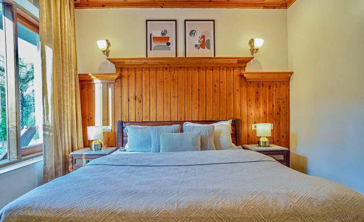 For 2 adults and two kids. A two- storeyed, A shaped Glass- Wood- And- Stone studio villa amidst an Avocado canopy and a small Kiwi vineyard and quite a few rare flower plants in the premise of our ancestral property. Vinatge setting, a fireplace, a freshwater spring, many ponds, a hammock and the constant chirp of birds to keep you company. Ideal for trekkers, readers, bird wacthers, nature lovers, meditation practitioners or people just looking for a quiet spot in a forest.