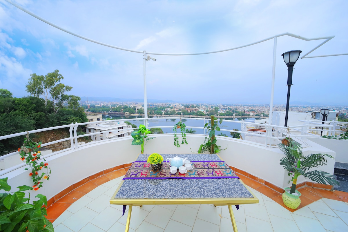 Nestled atop a charming hill, this exquisite 1-bedroom lakeview room is perched on top terrace of a centrally located, luxurious Vacation Villa-Hill Villa Signature Suites. With panoramic views of lake Fateh Sagar & Lake Swaroop Sagar, mountain range & city skyline, this upscale oasis offers a truly unparallel experience. Guests would also have access to Hill Villa's various shared spaces like multi-altitude Decks, Regal Lounge and Wellness zone with Jaguar 6-Seater Jacuzzi Spa & Steam-Bath Spa.