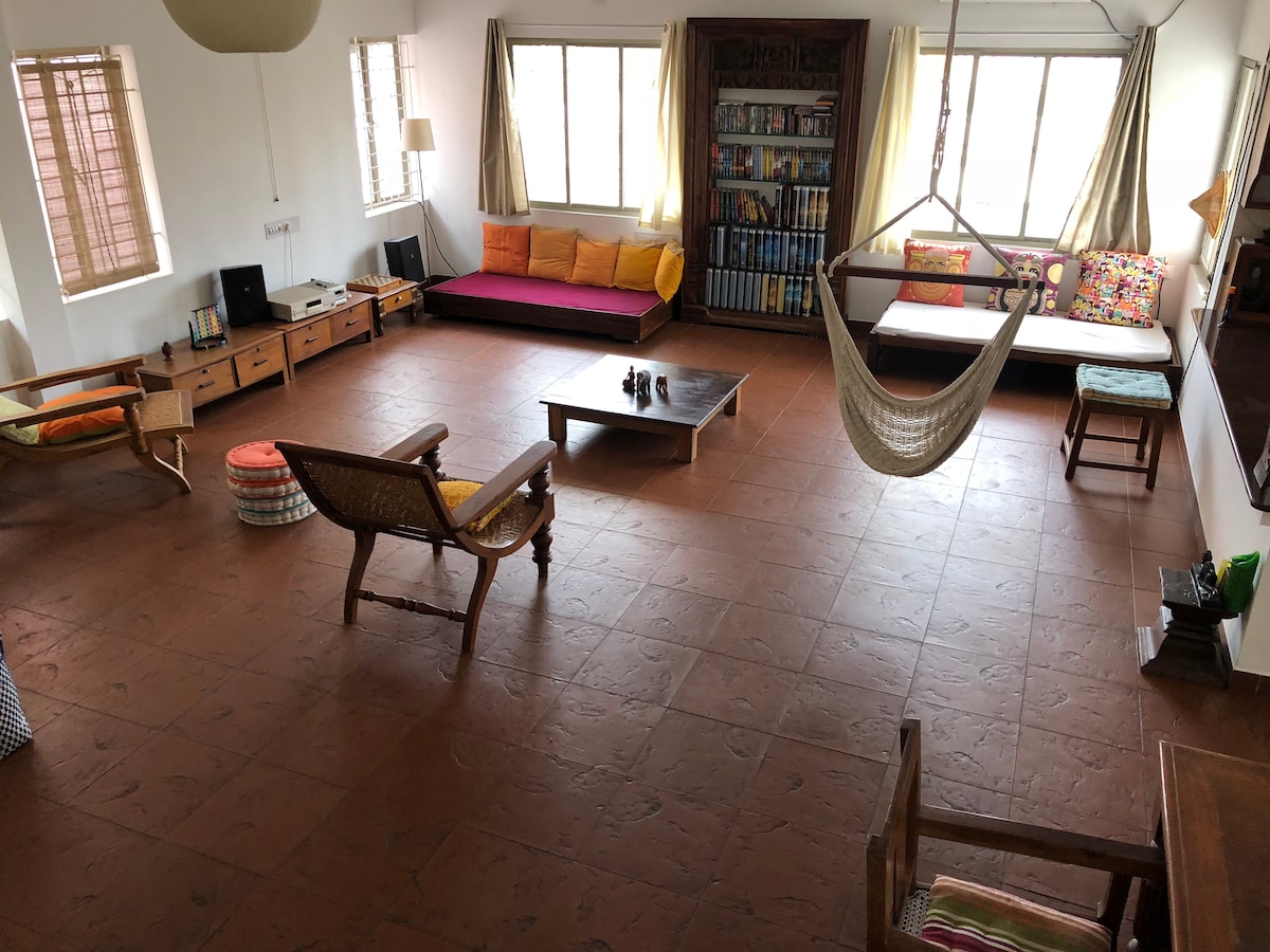 Enjoy a stylish stay in the heart of Pondicherry, Everything you need—beaches, shops, and restaurants—is within a 5 to 10-minute walk. Close to the French Quarter, Promenade Beach, markets, and cultural landmarks. Comfort: High-speed Wi-Fi, air conditioning, and a fully equipped kitchen. Loved for Design & Cleanliness: Guests appreciate the stylish decor and spotless space. Home Cinema: Enjoy movie nights with a projector and screen. Central loft—perfect for relaxing after a day of exploring