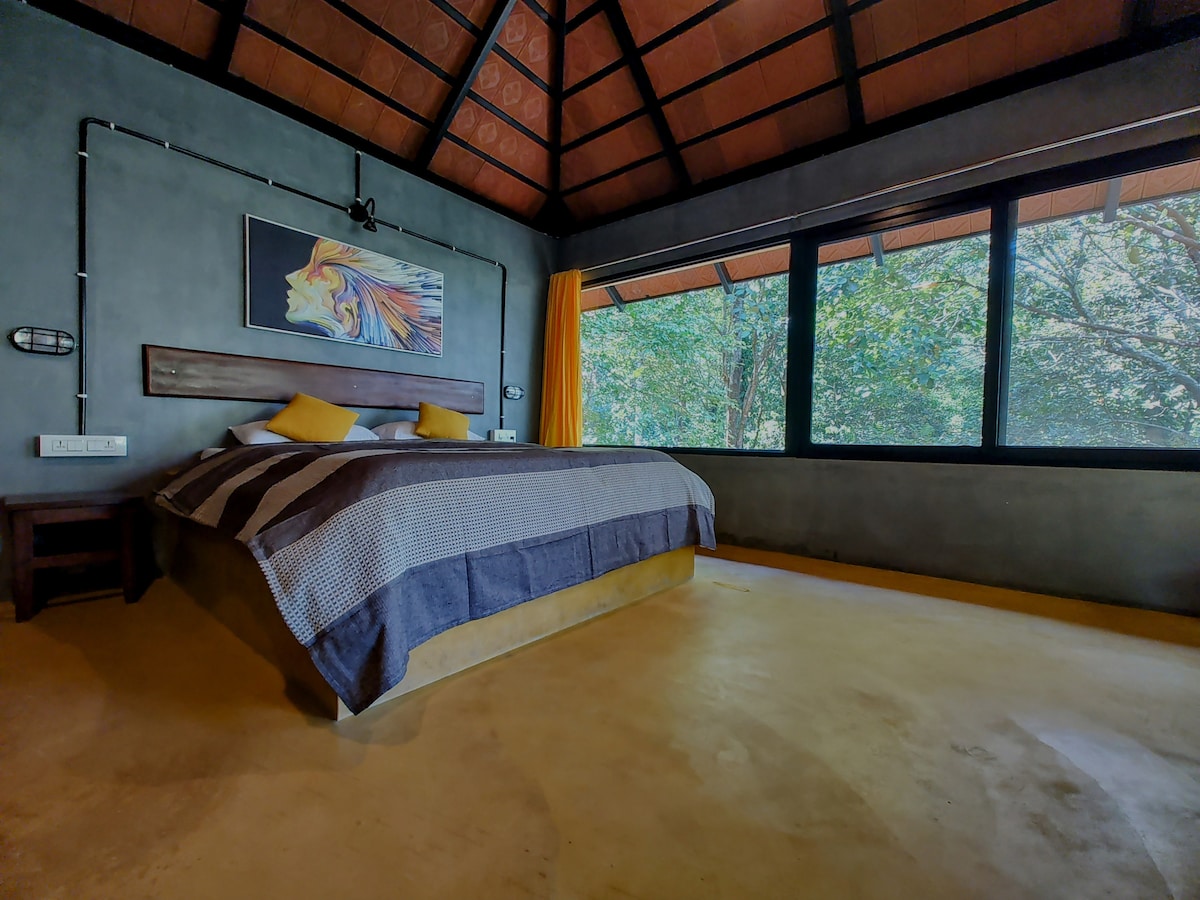 An independent cottage on stilts with wall to wall windows that offer great views of nature around & a balcony to complement this. Perfect for birders, nature enthusiasts, pet parents & people who want to chill amidst thick forests. Please note: The access to this cottage is a stoned staircase of around 25 steps down. People with mobility issues or obesity will find it difficult to access.