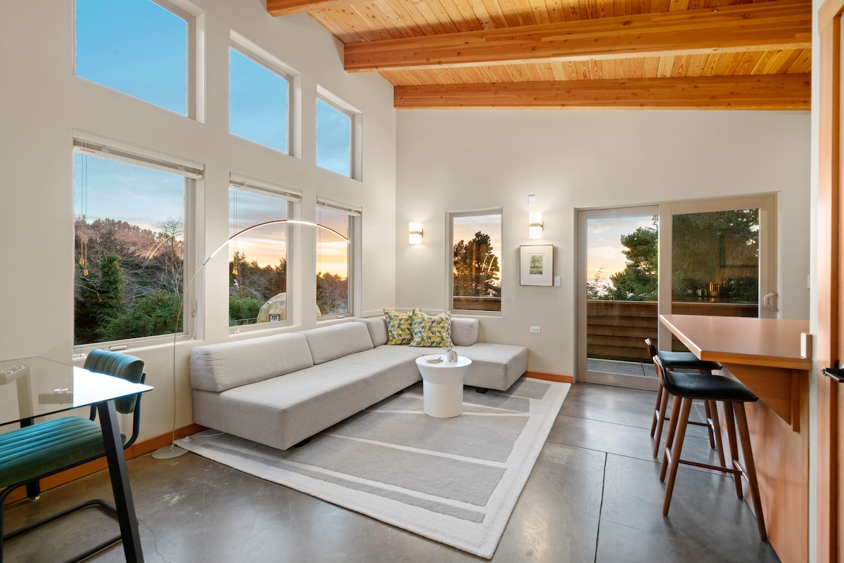 'Blue Pacific Retreat' is a contemporary space in Arch Cape w/panoramic ocean views, quiet and serene surroundings. Designed by an architect and interior designer the newly remodeled space (2025) is sophisticated, tasteful, and unique. Luxurious amenities; heated floors, luxury bedding, ocean views from living area and west deck, stocked, full kitchen, and NW art. This is 1 bdrm apt. above a detached garage on a quiet dead end street and is just a 9min to beautiful Arch Cape beach.