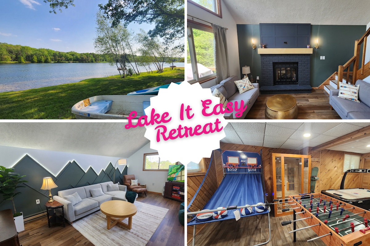 New 7 SEAT HOT TUB! In the heart of Pocono Mountains a newly renovated, modern, spacious & family-friendly chalet in an amenity filled community Private 3000sqft 4bed3bath home located on 1.5acres backing up to a nature preserve Enjoy the sauna, hot tub, game room, fireplace, fire pit We are in a community with 5lakes, 3beaches, fishing lake, 2pools, playgrounds, tennis & basketball courts Minutes from bird watching, hiking, wineries, skiing, indoor water parks, golfing & casinos