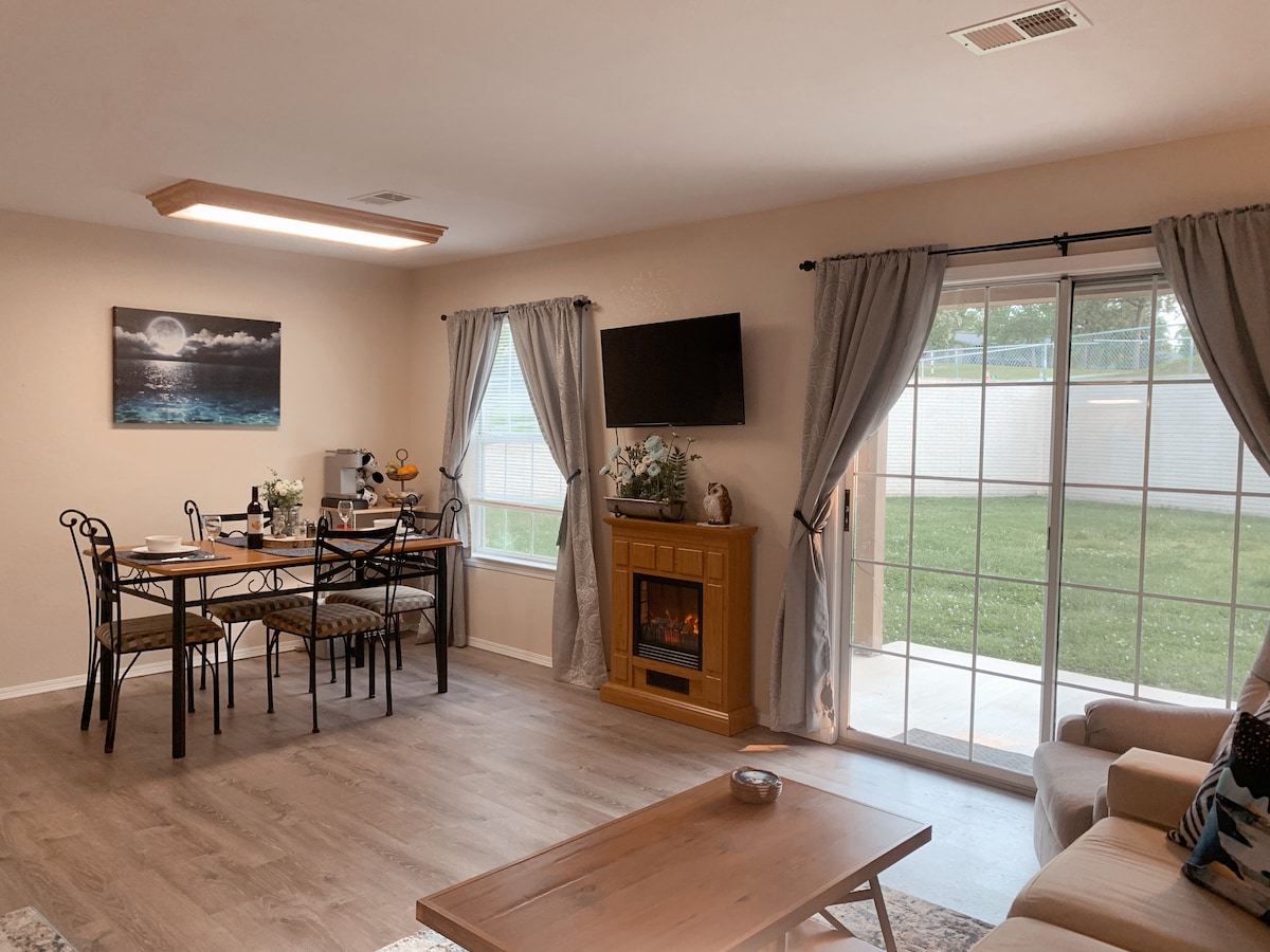 Newly remodeled with a touch of modern elegance. We are located just around the corner from Silver Dollar City in Branson. You will love the short walk to the water with a trail along the lake to enjoy this peaceful environment. The lake is visible in the winter when the trees are bare. With a seasonal pool, tennis courts, basketball courts and game room you will have plenty to keep the kids busy. Centrally located with a short drive to the strip. A peaceful, fun area to visit.