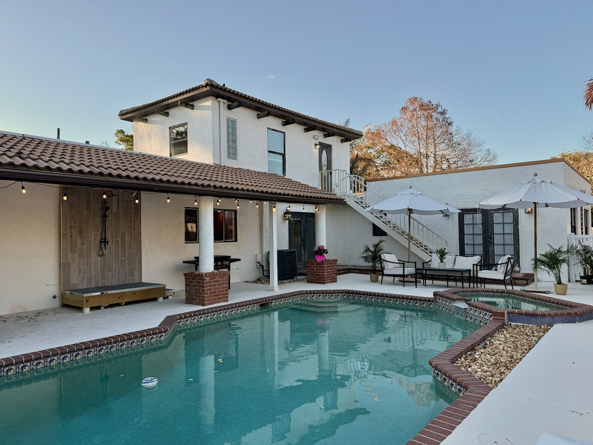 Escape to this private Spanish Hacienda nestled on 1.5 lush acres with a pool, serene pond, and RV hookups. Perfect for families or groups, this 5-bedroom, 4-bath home includes a private upstairs apartment. Enjoy nature, space, and charm just minutes from beaches, Jackie Robinson Baseball Complex, the fairgrounds, and Fellsmere horse events. Ideal for peaceful getaways, groups or active vacations—experience classic Florida with world flair.