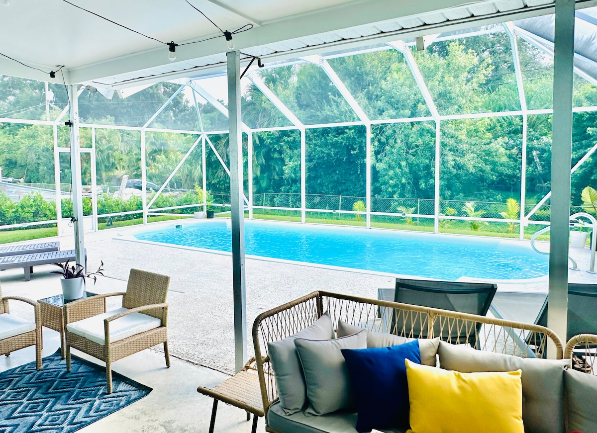 Welcome… to The Contemporary Cove FULL SCREENED BACK PATIO to protect you from the FL bugs.Step into luxury with this stunning contemporary oasis, designed to blend modern elegance with serene tranquility while feeling at home. Nestled in a quaint neighborhood, this home offers the ultimate retreat for those seeking style, comfort, and relaxation. ResortStyle Pool: Sparkling centerpiece surrounded by an oversized patio, outdoor lounge area, and firepit—perfect for entertaining or quiet evenings.