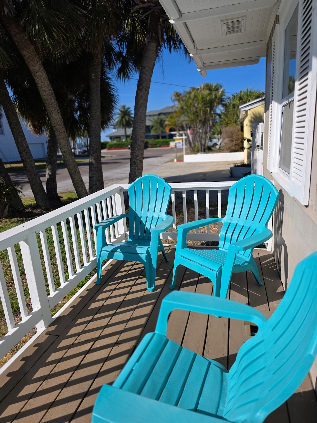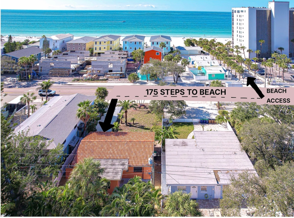 Stay in your own private 2 bedroom bungalow with easy beach access. No streets to cross, direct access to the beautiful white sand. Enjoy the beautiful turquoise water of the gulf. Walkable to restaurants, shops, local parks and plenty to do for adults and kids alike. No car? Jump on the trolley that stops out front and it'll take you to Clearwater Beach or Treasure Island. Your bungalow comfortably sleeps up to 5. King bed in one bedroom. A queen bed and a day bed in the other one.
