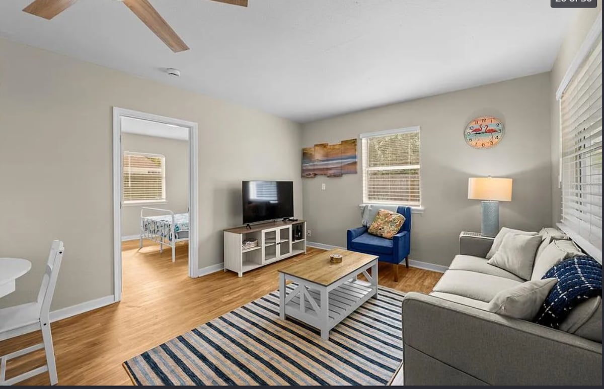 Just a short walk to the beach makes this a great beach getaway for couples or families. On your way you can stop at the Kooky Koconut for lunch, an awesome milkshake or a variety of snacks. With a totally new renovation in 2019, this unit is in updated, very clean and worry free condition. This cottage is located in a quiet residential neighborhood and a great place to relax. Common laundry on shared screened porch. Dogs allowed (extra $45 cleaning). Easy refund policy. Level 2 EV charger