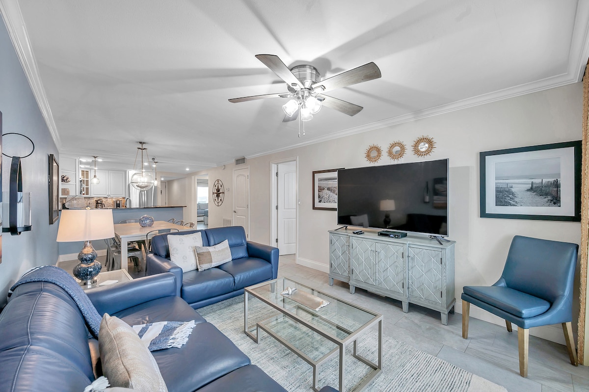 Our 2 bed 2 bath has everything you need for vacation. Amenities include Intracoastal access, pool, spa, tennis and pickleball courts, putting green, fishing dock, boat slips, shuffleboard, BBQ, beach gear & board games. Beach is just across the street! Trolley stop is outside. Save your money- we provide putters, balls, shuffle board set, beach towels, chairs, boards & cart. Rent kayaks & boats right down the road. Walk to restaurants, PuttPutt Golf & more!