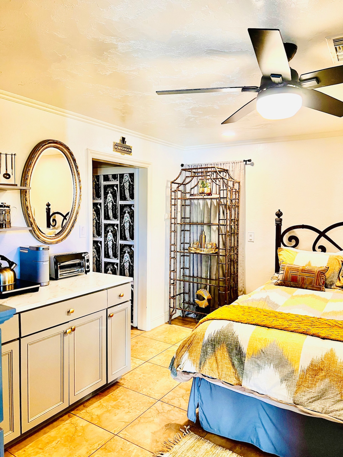 Our Legacy Palms king bed studio suite is a newly renovated, spacious & bright space with a modern California-desert vibe. French doors open to a private balcony overlooking the lush villa grounds & water fountains. The suite features a smart TV with premium cable, mini-fridge, microwave & Keurig coffee maker along with a en-suite bathroom that has a soaking tub & separate shower. The community grounds feature 12 heated pools and spas, a gym, hammocks, grills & much more!