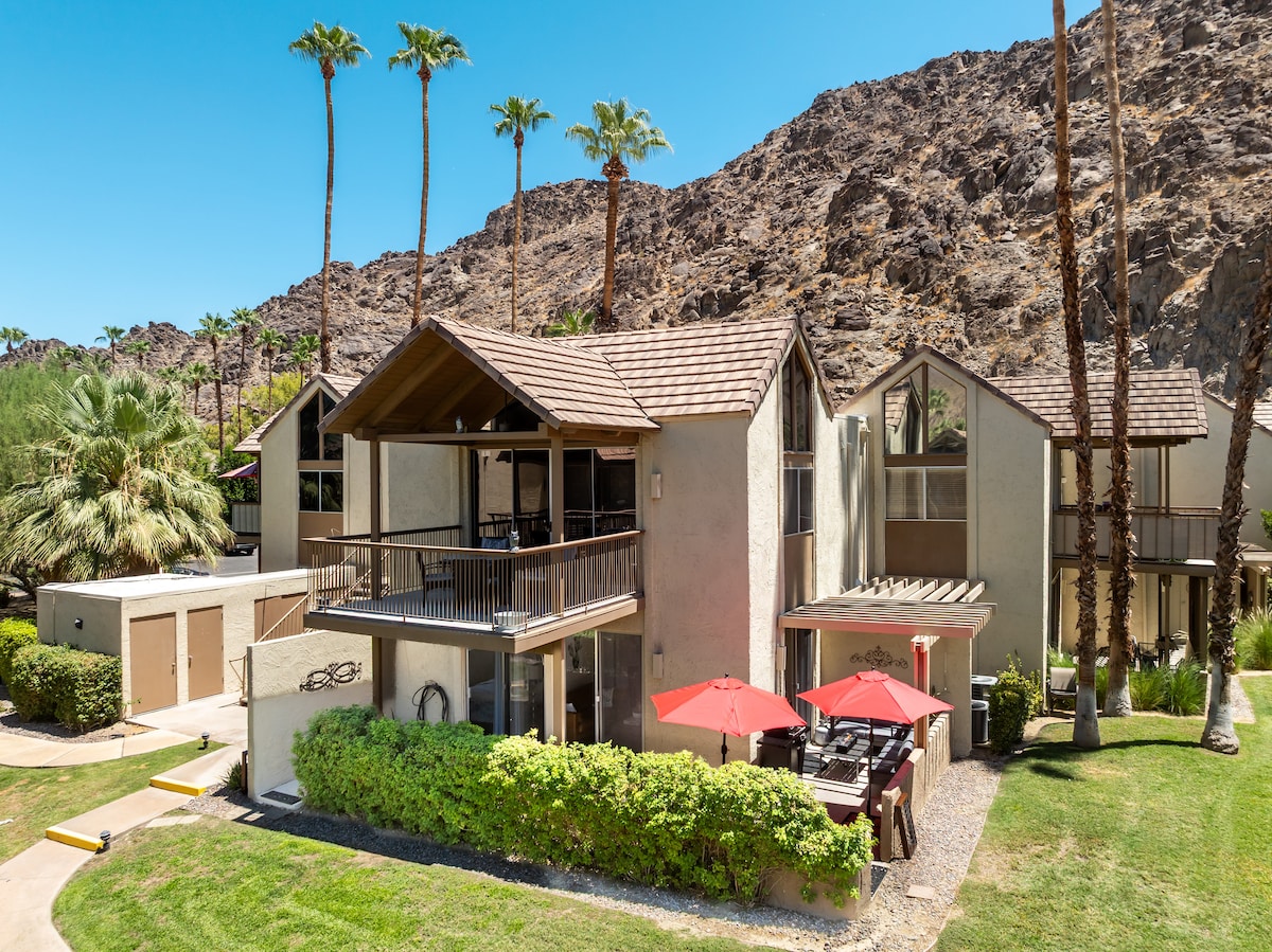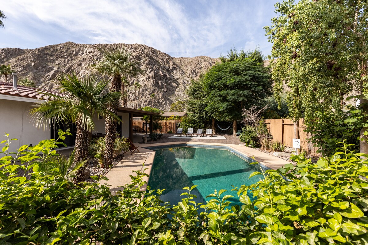 Travel back in time in this mid-century design garden house with mountain views. The home boasts original architectural features, retro furnishings and decor contrasted with modern amenities, a BBQ patio, and a covered outdoor seating area with great views. The home is lusciously landscaped with exotic varieties of desert plants and mature trees and the oasis-like pool area invites a sense of relaxation and peace. Short term rental permit #066151