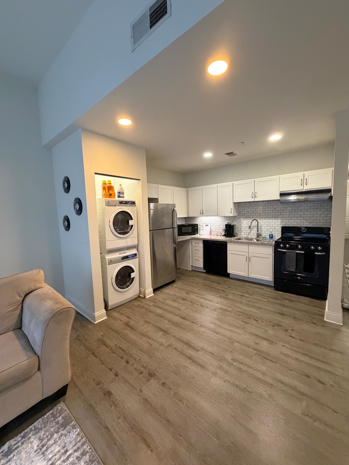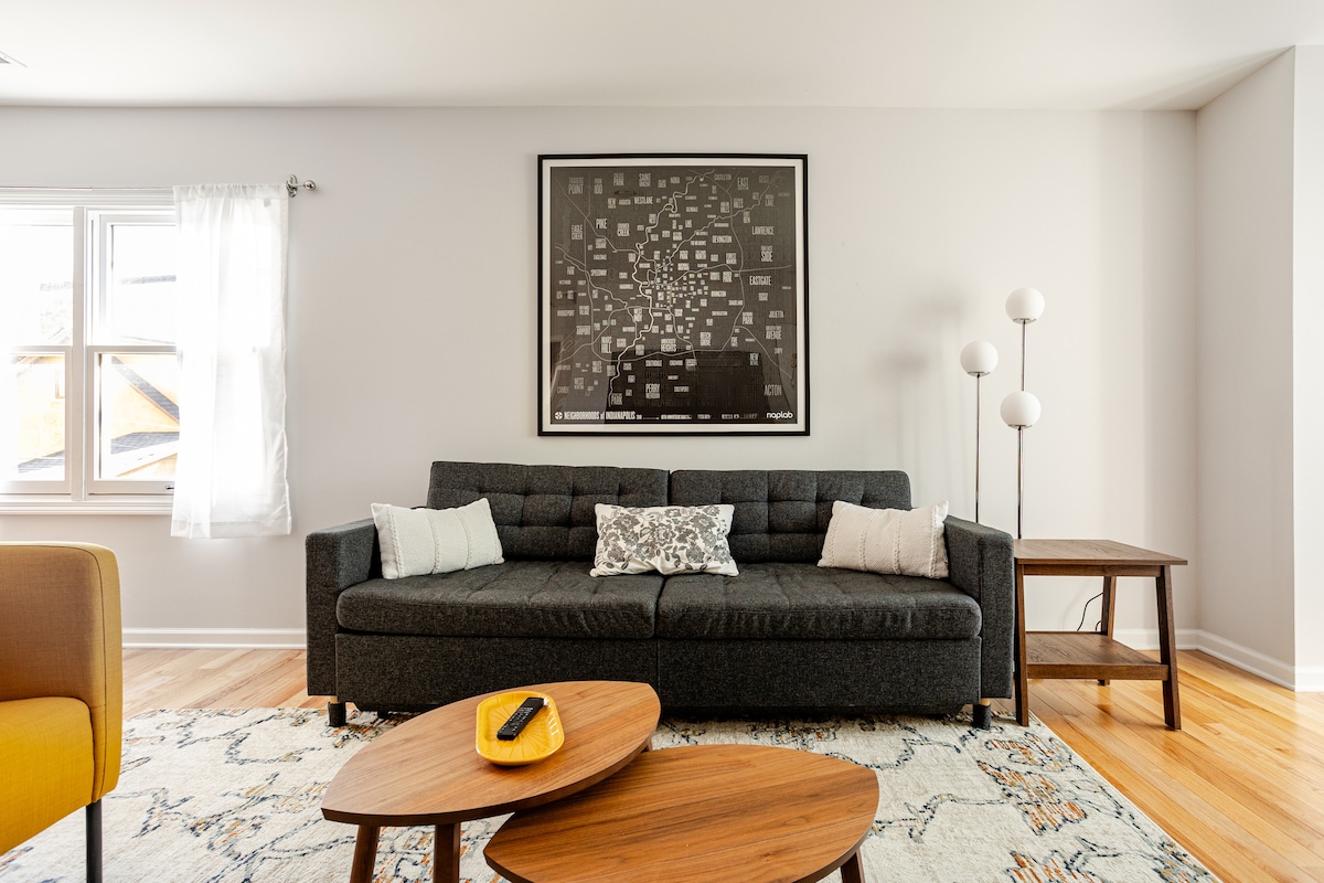 ⭐ Free Parking ⭐Blocks from Mass Ave/Indy’s hotspot ⭐Early check in/late check out $25 ⭐ Spacious & stylish suite-style layout ✦Walking distance/short drive to major attractions ✤ Clean! ✤Top-rated host's/we’re local! ➠ Cultural Trail/World Class 🛌 Private bedroom/ King bed 🛋 Queen fold-out sofa ⭐Suite-style layout – cozy yet spacious ◉ Keurig coffee maker ◉Two-burner hotplate/ toaster oven ➠back door, securely locked/ no guest use ➠Basement door locked/no street access