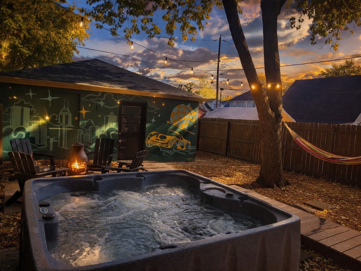 Location, Location, Location!!-- 4 mins to Lucas Oil Stadium, 6 mins to Downtown Indianapolis, 15 mins to Indianapolis Motor Speedway. • 4 themed bedrooms: 1 king, 3 queen, 1 full, 1 twin + sofa bed (sleeps 12). • Game room: pool table, ping pong, arcade, darts, shuffleboard, skee-ball, board games. • Backyard: hot tub, 2 fire pits, pergola w/ egg chairs, outdoor TV, 15 ft golf putting area. • Theater room w/ 150” screen. • Full kitchen, dining space + free street & private parking.