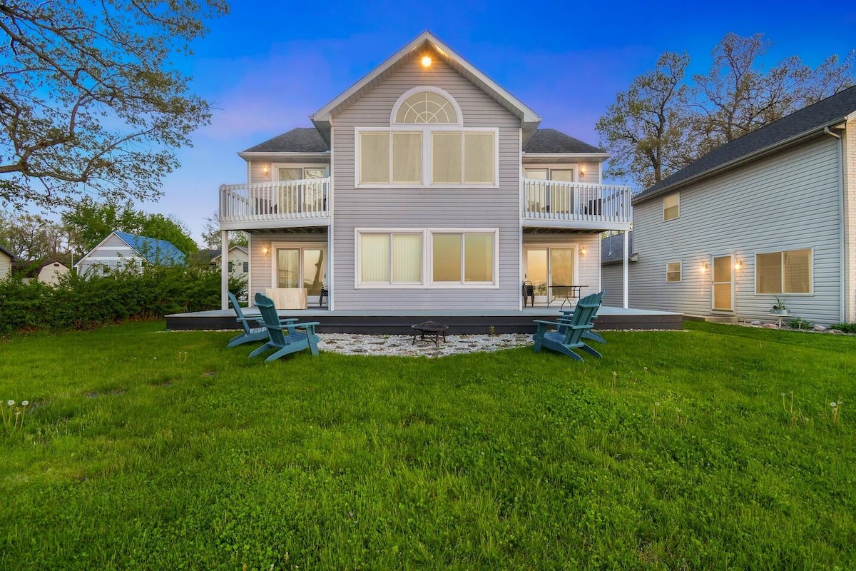 Lakefront 8Br 5Bath (Sleeps 24). Unobstructed views of Lake Michigan & steps to beach. Firepit, WIFI, Big Weber Gas grill, fireplace, etc. Lower level (walk-out) redone with LR, 3BR, new Bath and laundry. 1st floor open plan - new kitchen, bath, and wood floors! 2nd & 3rd floors brand new - 2nd floor with 4 BR & 2 Ba - 2 BR w/doors 2 deck facing lake! Spiral stair to 3rd floor loft/Br w/6 twins, Full Bath & deck. Beach is virtually private at this, the far end of Michigan City's public beach.