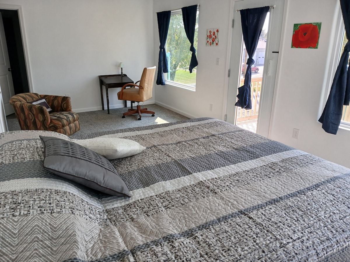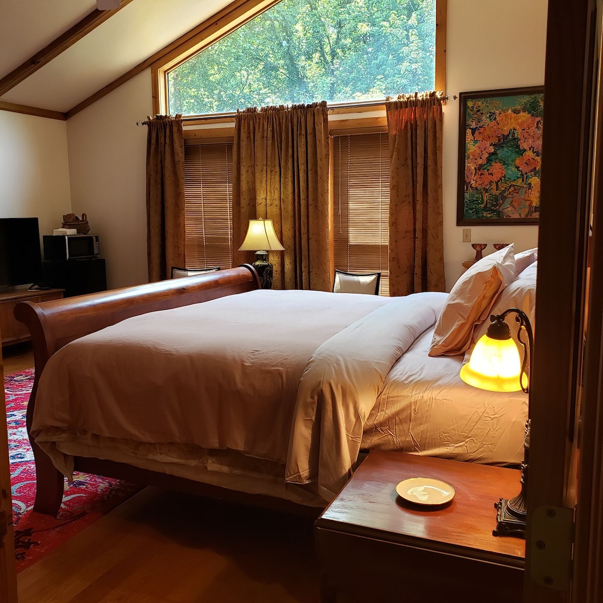 Welcome to our spacious log home on 2 acres with plenty of gathering space. You are reserving an upstairs huge king bedroom, two twin beds & private bath. This is our residence, so most likely we will be on site. We do have 3 other listings: Cozy Room, Lauren’s Room and Lindsay’s Room if you’re needing more space that accommodates up to 12 guests. Keurig, chilled water & snacks are available. Ring doorbell & Security camera on site for protection.