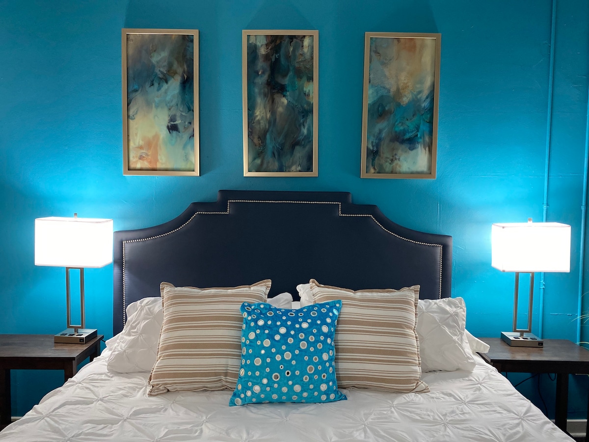 The Gallery is a 2 bedroom 1.5 bathroom suite with amazing city views. Located on Illinois and Market Street, you will have a birds eye view of Monument Circle and The Arts Garden. Enjoy a clean, spacious, and private stay while being close to all Indianapolis has to offer. Lucas Oil, the Indianapolis Convention Center, Gainbridge Fieldhouse, and popular restaurants are all in walking distance All art work on display are sourced from local artists.
