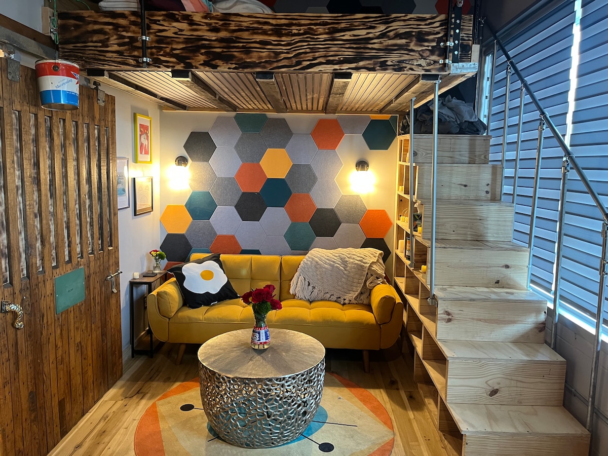 The Mod Pod is a funky atomic space located in the historic district of downtown New Albany Indiana- located next to our sci fi diner Lady Tron’s. The Pod sleeps up to 4 guests with a queen loft bed, full sized pull out, twin sized roll away. Don’t let our vintage vibe fool you- we have all of the creatures comforts! High speed internet 85 inch google tv Ample device charging Kitchenette with fridge/freezer, microwave and coffee maker Walk in shower Bidet Hair dryer and iron