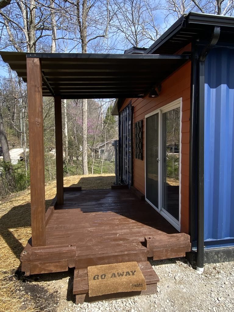 Welcome to our modern shipping container home, tucked away in a 3 acre section of woods. This 40 foot high cube has been transformed into the perfect place to allow you to relax and escape reality. This Oasis includes everything from a porch swing daybed, hot tub, fire pit, and dual sided fireplace. The details are unmatched.