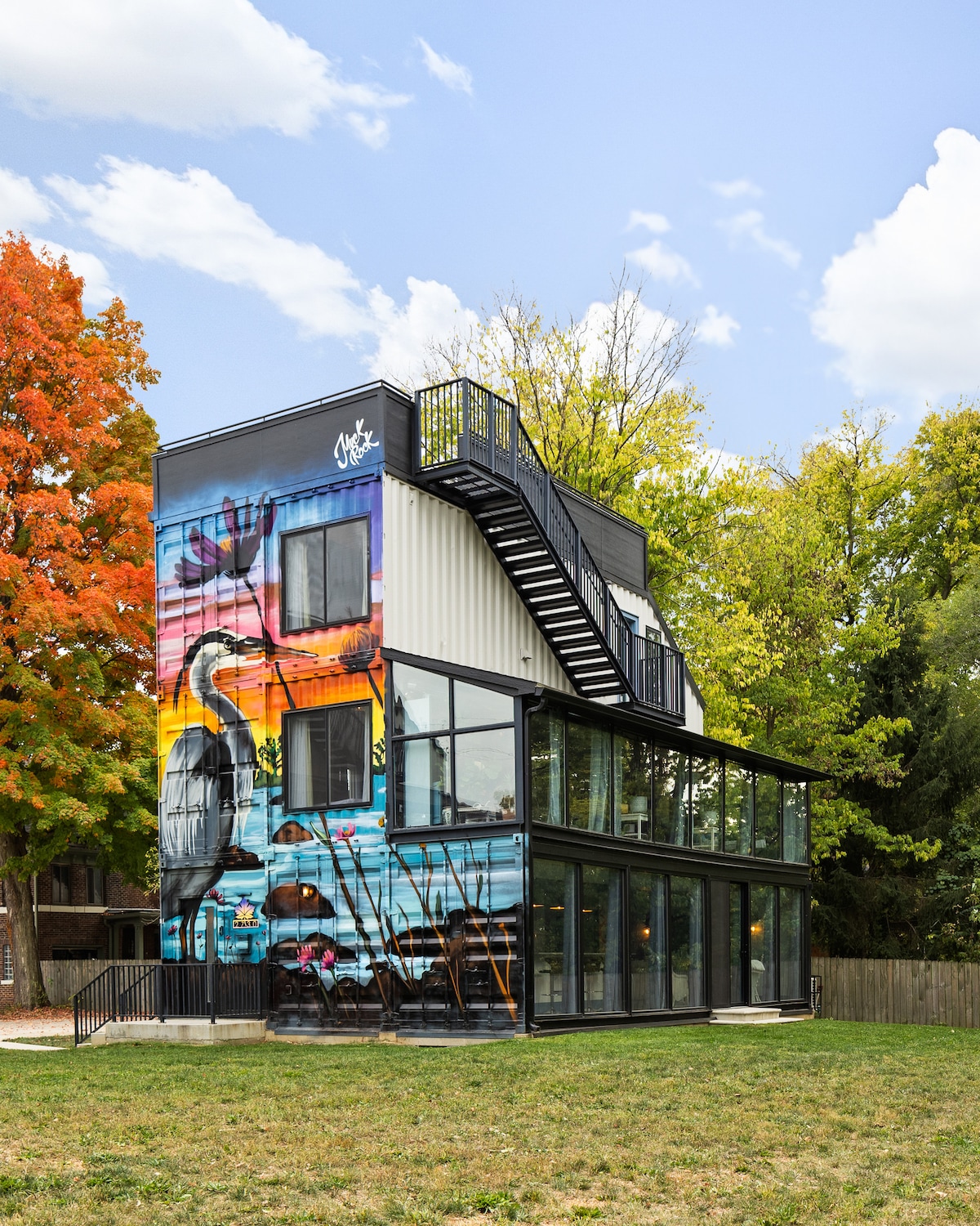 “The Shadowbox" pop culture container home in downtown Indianapolis is one of three container homes located on the lot. The home is comprised of 7 shipping containers with an added greenhouse & rooftop deck overlooking the city skyline. The floor to ceiling windows on the first & second floor both face & provide a unique perspective of Fall Creek River. The home has a large back yard. Plenty of comics, action figures & games to keep you entertained throughout your stay.