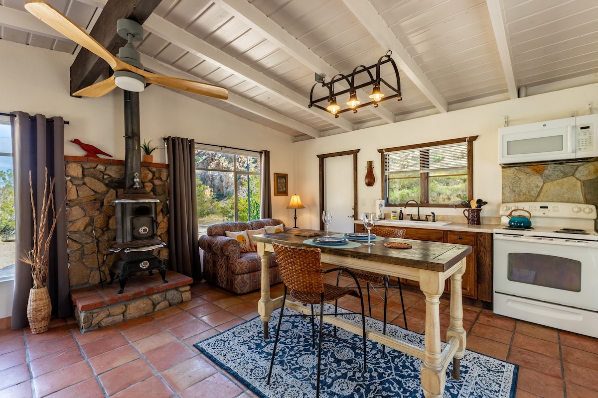 Mockingbird Cottage is a nature lover’s haven nestled up against a hillside on 2 private acres. This fully renovated, light filled, midcentury gem has high vaulted ceilings, a filtered water system, chef’s kitchen, folding glass doors that open to a birdwatching + yoga patio and a hot tub for stargazing. Located just a stone’s throw from Big Morongo Canyon Preserve, this dreamy hideaway offers a front row seat to 200+ species of migrating birds plus rabbits, squirrels and butterflies.