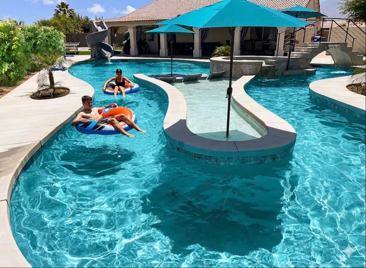 Welcome to your private desert oasis! Unwind and soak up the sun in our one-of-a-kind backyard retreat,featuring a spectacular private LAZY RIVER POOL A lazy river, crystal-clear Caribbean-style for endless floating fun, a “Tornado” waterslide, and a rainfall bridge. Enjoy in-pool loungers for ultimate relaxation, pool basketball, outdoor Bluetooth speakers, a BBQ grill, elegant dining and lounge areas,and a soothing hot tub for starry desert nights Your unforgettable desert getaway starts here