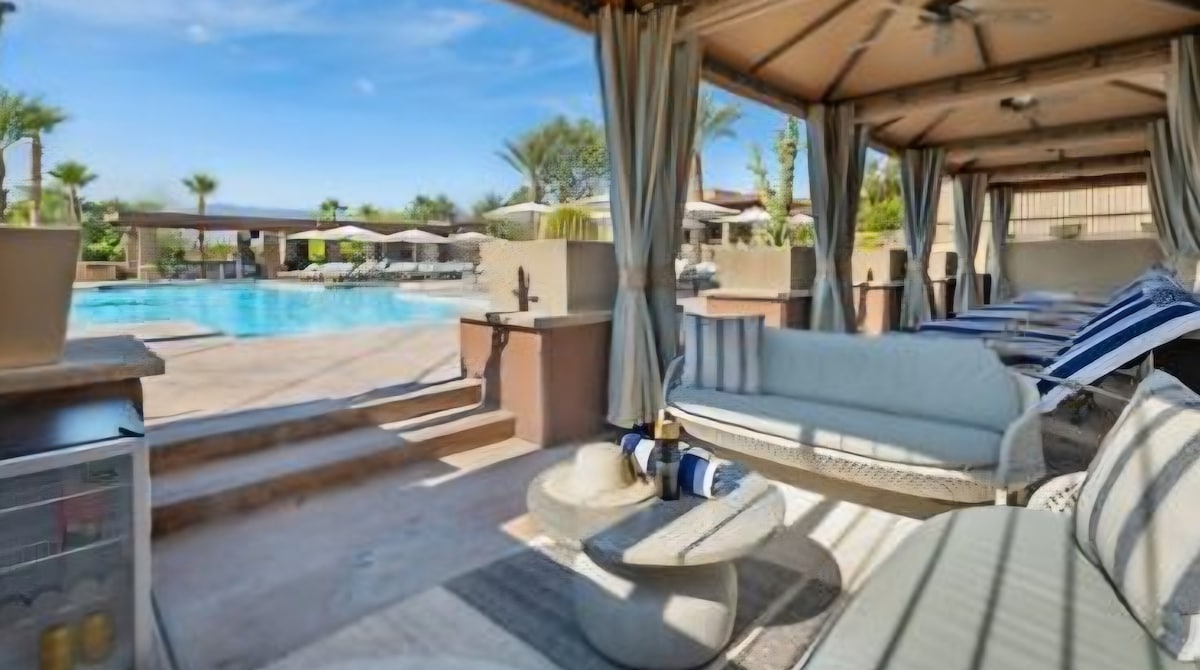 Welcome to the Palm Desert Lifestyle. - Stylish interiors with 1204 sqft of space, separated living areas, and outdoor patio. - Experience the comfort of a vacation home that feels like home. - Access to seven pools, championship golf, a fully equipped fitness center, and dining options on-site. - Breathtaking mountain views and proximity to attractions like Joshua Tree National Park and El Paseo shopping district. - Enjoy complimentary WiFi with no resort fees!
