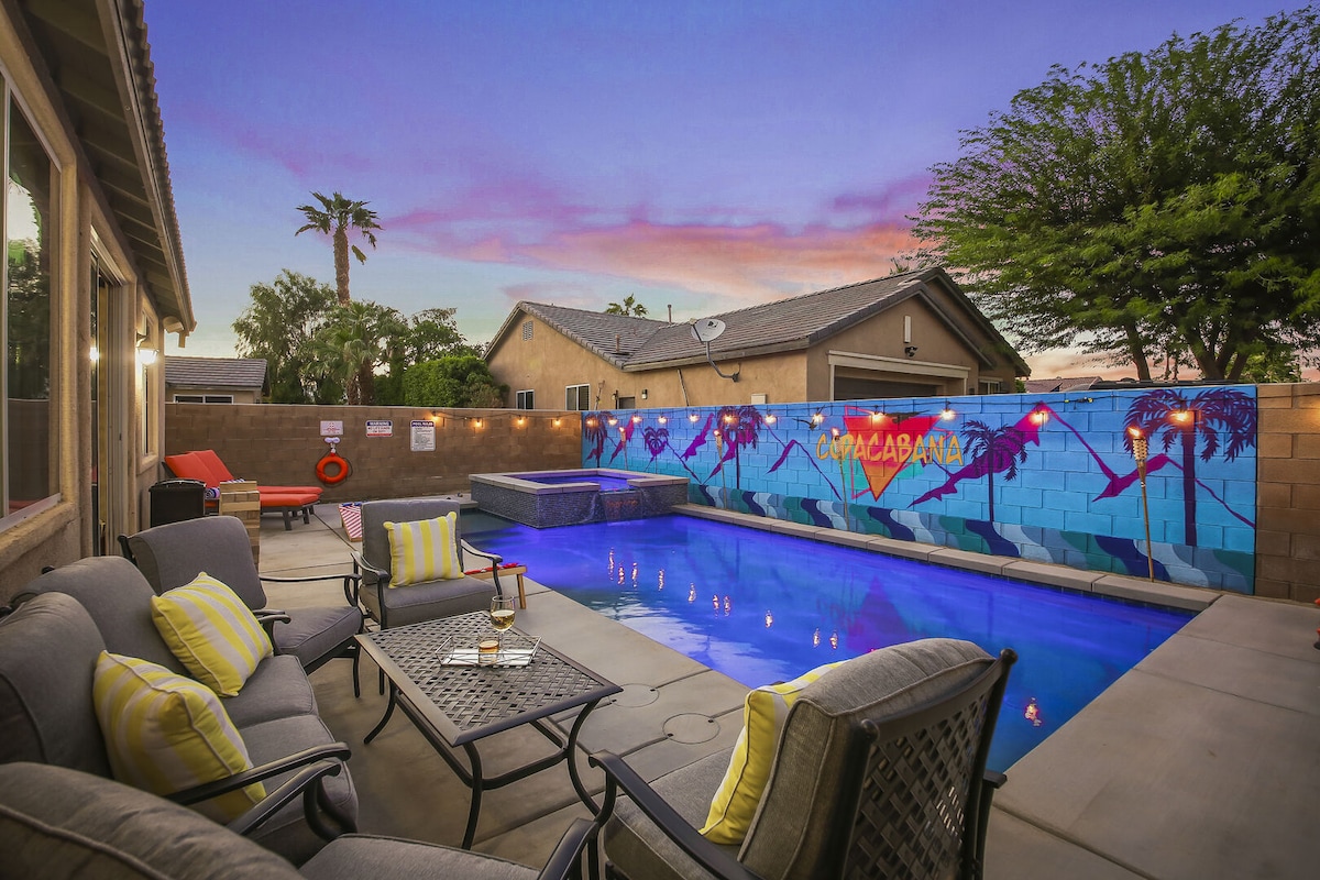 Welcome to your desert getaway! This 6-bedroom, 2800+ sq. ft. home is 2.3 miles to the Coachella festival grounds and is complete with pool, spa, game room & pool table, firepit, outdoor living and dining, bbq/bar, and more. Spend a weekend poolside playing on the putting green, barbecuing, or sipping margaritas from a lounge chair while listening to outdoor Sonos speakers. Inside, you'll find a chef's kitchen, smart TVs in all bedrooms, and a game room with pool table and arcade machine.