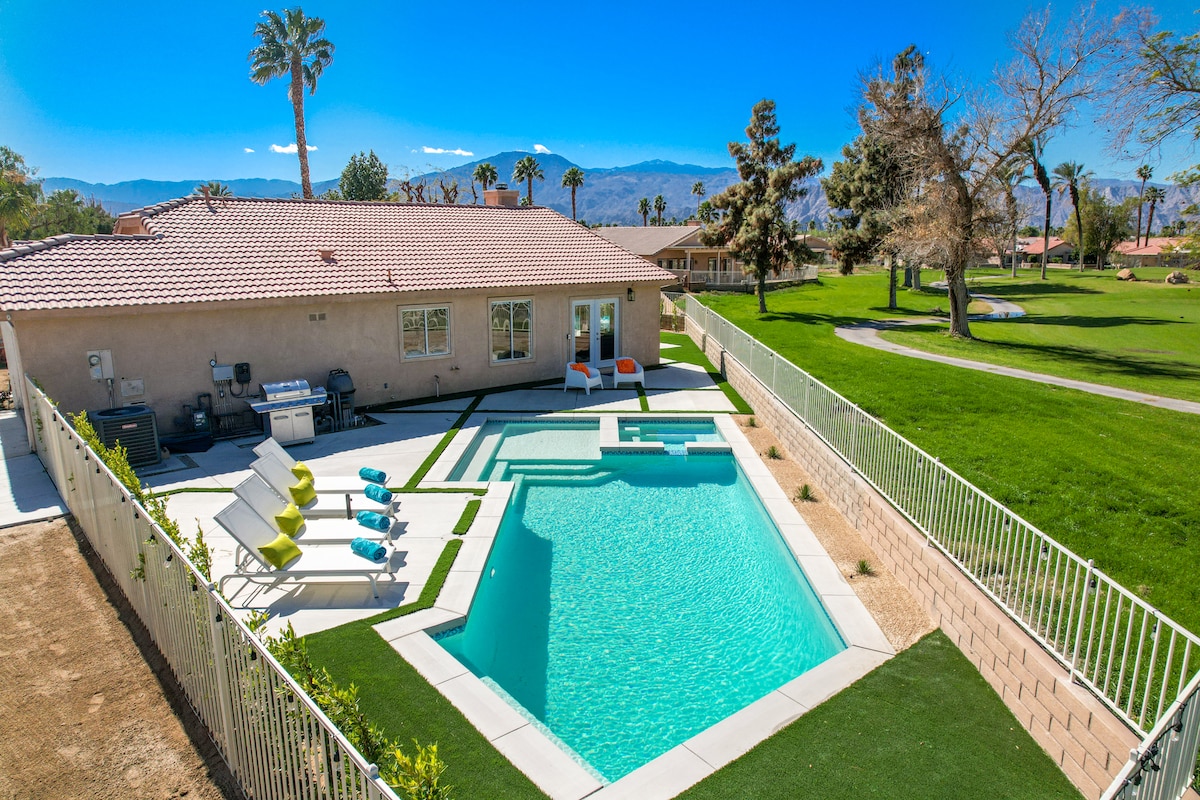 Everything brand new and entire house renovated recently. Heated salt pool /spa and pingpong table, firepit, pergola, putting green, corn hole, zenga in backyard. Enjoy beautiful sunset with mountain views. Outdoor dinning table with Weber bbq grill. Foosball/70" TV w/ YoutubeTV/Netflix/Disney+. A fully-stocked gourmet kitchen, purified water, coffee machine w/free pods. Hotel-style amenities. Very close to Coachella (5mins), BNP(10mins), all stores, restaurants. Small dogs only. LIC-22-00028249