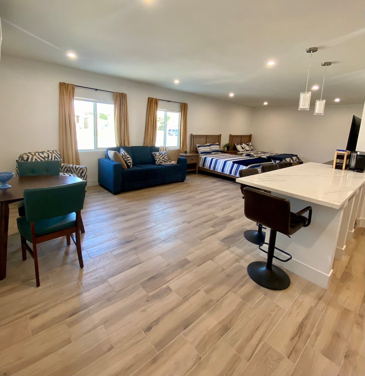 This charming desert casita accommodates four guests. It features one private bedroom with a queen bed and a queen sofa bed in the living room (please note: the second sleeping area is in the living room). Includes a full bathroom, fully equipped kitchen with stainless steel appliances, and washer/dryer. This private space offers many comforts and is close to local festivals, hiking, and everything the Valley has to offer. Read the full listing for more details.