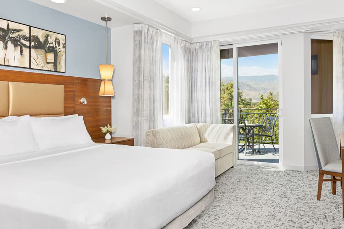 Our Legacy Palms king bed studio suite is a newly renovated, spacious & bright space with a modern California-desert vibe. French doors open to a private balcony overlooking the lush villa grounds & water fountains. The suite features a smart TV with premium cable, mini-fridge, microwave & Keurig coffee maker along with a en-suite bathroom that has a soaking tub & separate shower. The community grounds feature 12 heated pools and spas, a gym, hammocks, grills & much more!