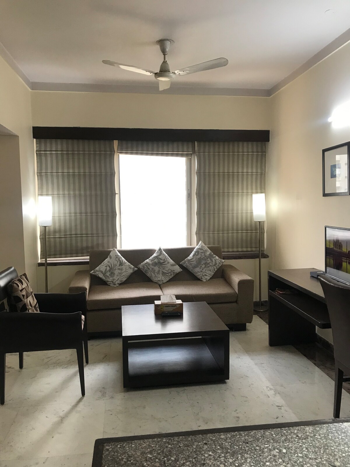 Beautiful, 2 bedroom apartment on the top floor of penthouse with spacious living room and very nice roof top garden in a secure society. Walking distance to market place, multiplex, and two Blue line metro stations. Both bedrooms are air-conditioned and have LED TV and shared living room has 55 inch LED TV. Fully furnished with wardrobe and drawer in each bedroom and luxuriously furnished bathrooms. The larger bedroom has a walk in wardrobe. Kitchenette has microwave & other appliances present