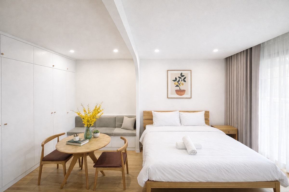 Stylish Studios & Long-Term Apartments near West Lake Prime Location: Enjoy the tranquility while being just a 2-minute walk from West Lake's serene beauty. Modern Comfort: Our stylish studios are fully furnished and equipped with everything you need. Peace and Quiet: Escape the city bustle and unwind in the peaceful setting. Ideal for: *Business travelers seeking a quiet haven. *Vacationers wanting to explore Hanoi's beauty. *Digital nomads looking for a comfy home base.