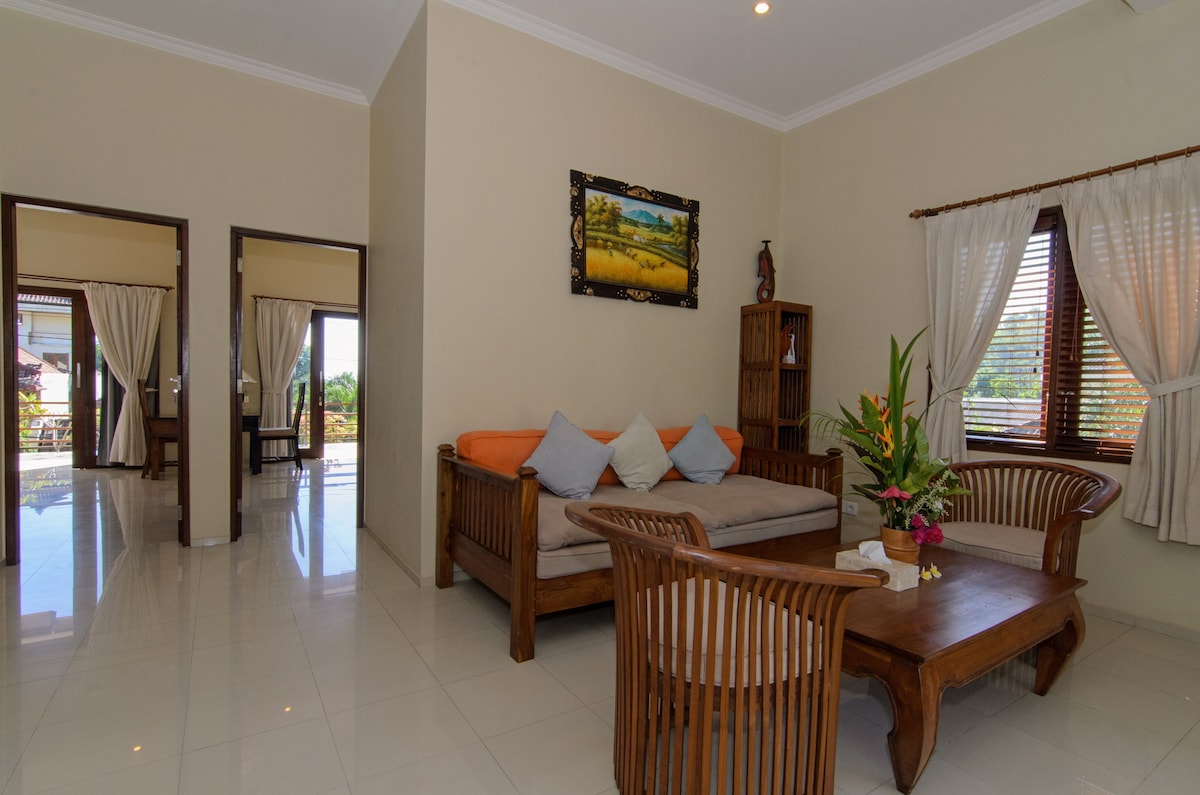 Luxurious private villa with 6x3 meter pool. Secure, private, safe. Lush garden and sheltered but open air kitchen for dining and relaxing by the pool. Queen bed, outside tub and shower, with fish pond view, fully equipped kitchen. AC, TV, great WiFi, daily cleaning and set breakfast is included. We are an 8 minute walk from the main road, or a short scooter ride. This means peace and quiet, and no car noise. Our staff will be happy to drive you in by scooter if needs be.