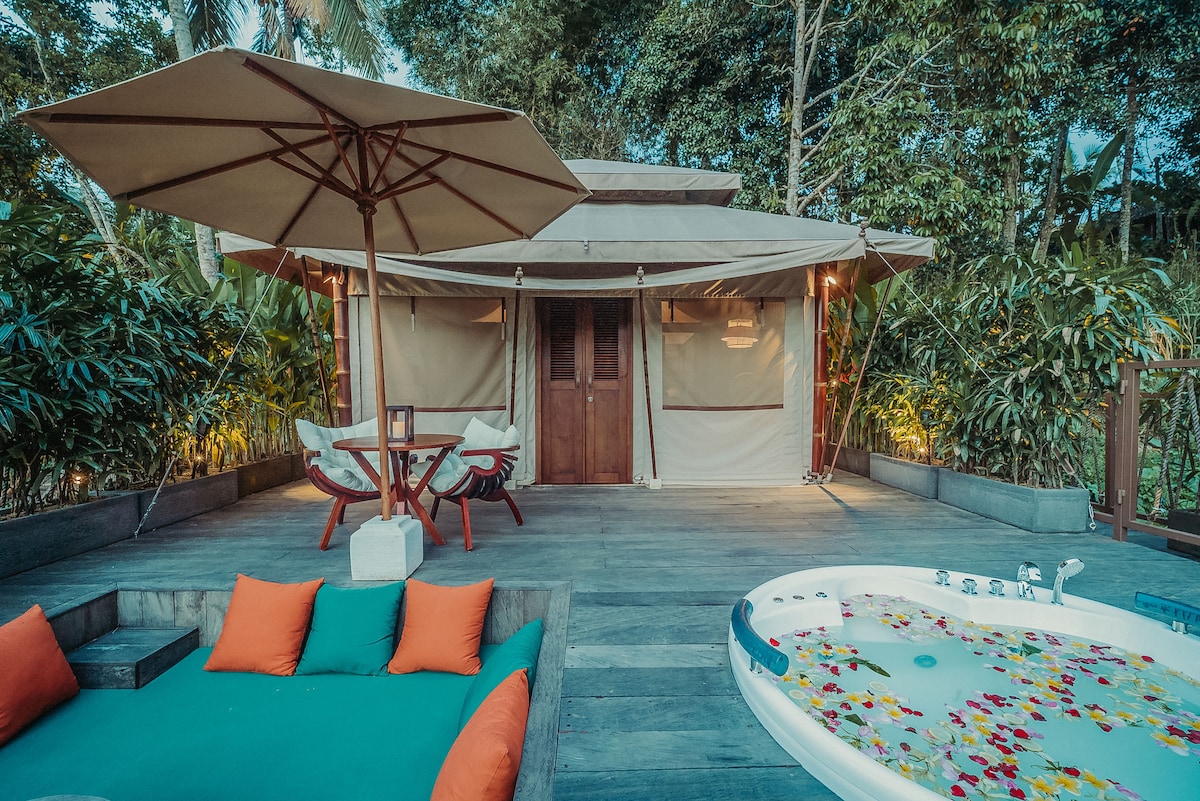 A unique semi-luxury safari-style canvas tent on a stilted wooden deck in the middle of our private plantation. The tent's terrace offers spectacular views over a river valley and surrounding plantations and rice fields. The spacious tent has a one-of-a-kind open-air comfortable bathroom, made of wood and bamboo. Views are the best from any bathroom in Bali, and beyond…!