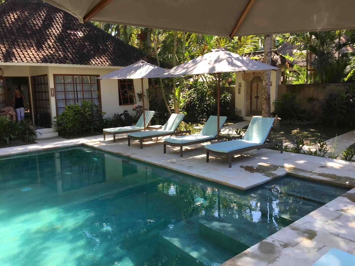 Beautiful private one Bedroom villa with 6x3 meter pool. secure ,private,safe. lush garden and sheltered but open kitchen for dining and relaxing by the pool. queen bed,bath room open shower, fully equipped kitchen. ac,tv, great wifi, daily cleaning and set breakfast is including. in a lovely village call Penestanan Kaja. It is only 2 km away from Ubud center.
